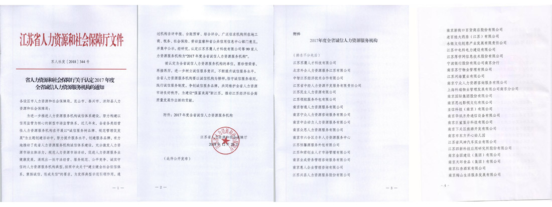 2018年12月20日,在省人力資源社會保障廳開展的人力資源服務機構誠信服務主題創建活動中,南京寧眾人力資源咨詢服務有限公司第三次榮獲“全省誠信人力資源服務機構”榮譽稱號。寧眾人力的獲選體現我公司一貫堅持的“依法經營、公平競爭、規范服務、誠實守信”的經營準則,是省人社廳給予我們的巨大鼓勵和鞭策,我們一定要珍惜榮譽、再接再厲、繼續拼搏、勇創佳績,為推進人力資源服務行業健康發展貢獻我們的一份力量。